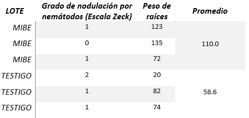 Se retiró el cubo a fin de campaña y cuantificó la masa radicular y la sanidad de ellas, comparándose con un cubo instalado en un área testigo con condiciones similares a las del tratamiento.