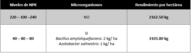 La fertilización química en quinua para la zona de Santa Rita comercialmente se usa 220-100-240 unidades de NPK, para comprobar la efectividad y propiedades de las bacterias Azotobacter salinestris como fijador de nitrógeno y Bacillus amyloliquefaciens, se redujo las unidades de fertilización a 40-80-80 de NPK. Con la significativa reducción de la fertilización química y la aplicación de biofertilizantes a base de Azotobacter salinestris y Bacillus amyloliquefaciens se obtuvo un rendimiento de 3103.8 Kg/ha frente al testigo con solo fertilización química que obtuvo 2162.5 Kg/ha.