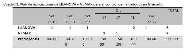 Cuadro 1. Plan de aplicaciones de LILANOVA y NEMAX para el control de nematodos en Granado.