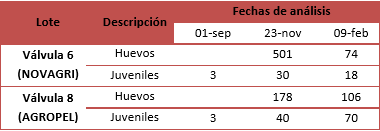 Gráfica 1. De la fluctuación de poblaciones de juveniles y huevos, en dos lotes de granado; válvula 6 con aplicaciones de productos de NOVAGRI SAC y válvula 8 con un manejo que realiza Agropel.